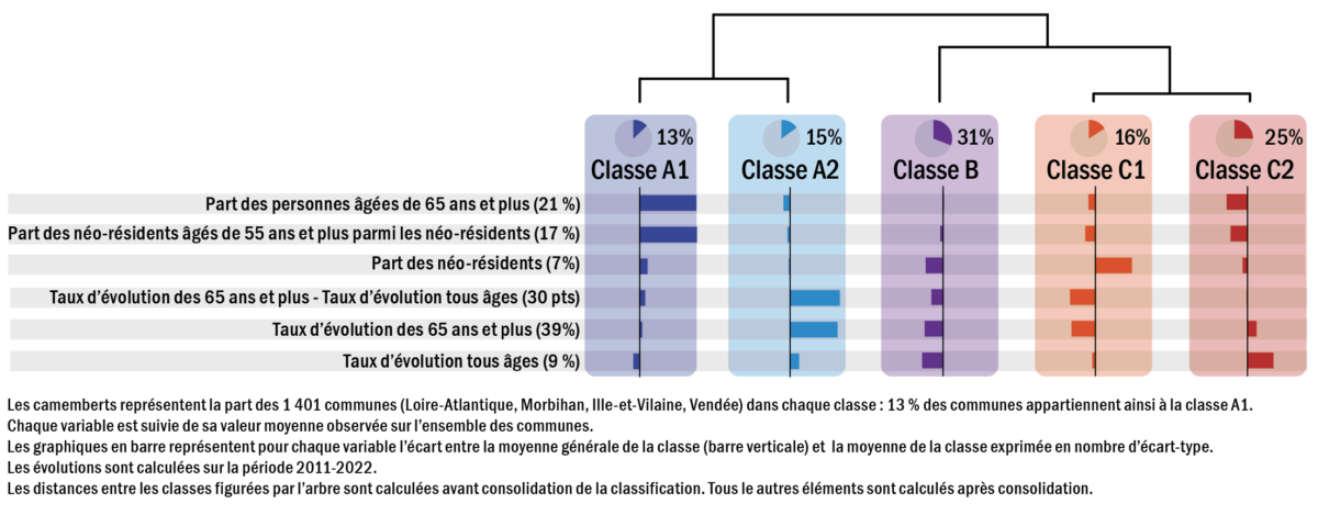 [La construction des groupes suit une méthodologie statistique rigoureuse en trois étapes : une analyse en composantes principales pour identifier les dimensions structurantes du vieillissement, une classification ascendante hiérarchique pour déterminer les regroupements pertinents, puis une consolidation par l’algorithme des k-means pour optimiser l’homogénéité interne de chaque classe. L’objectif : obtenir des groupes de communes aux profils de vieillissement similaires, tout en maximisant les différences entre ces groupes.]