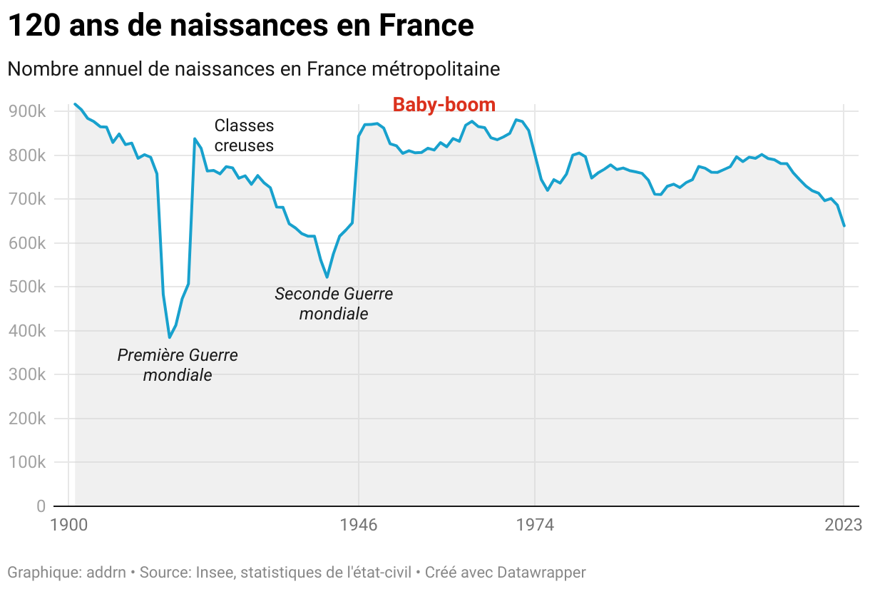 En France, le baby-boom s’étend de 1946 à 1974, période durant laquelle on enregistre plus de 800 000 naissances annuelles. À la forte hausse de la fécondité d’après-guerre, succède un effet générationnel : quand la fécondité redescend progressivement, l’augmentation du nombre de femmes en âge de procréer – les filles des premières baby-boomeuses – prend le relais pour maintenir un niveau élevé de naissances.